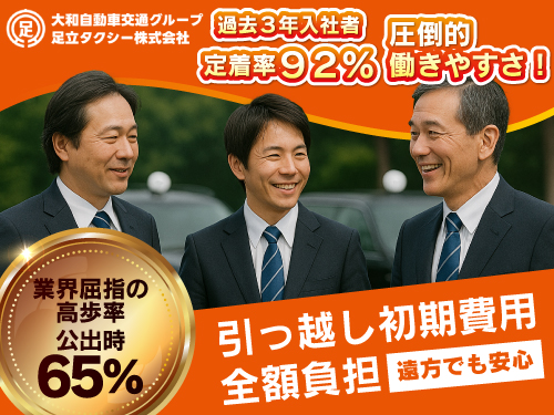 【都内で数少ない“働きやすい職場認証制度『三つ星』認定企業”】 ◆最高歩率68%! ◆全員対象!入社祝金最大35万円支給! ◆大手4社の大和自動車交通グループ ◆徒歩20秒!会社向...