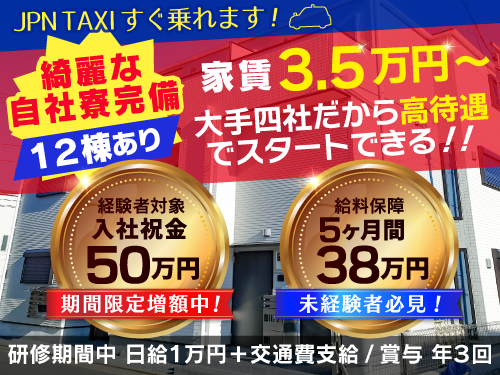 ◆ジャパンタクシーすぐ乗れます! ◆入社祝金最大30万円支給!※経験者対象※社内規定あり ◆祝金10万円支給!※未経験者対象※社内規定あり ◆給与保証制度あり:乗務開始から8ヶ月間...
