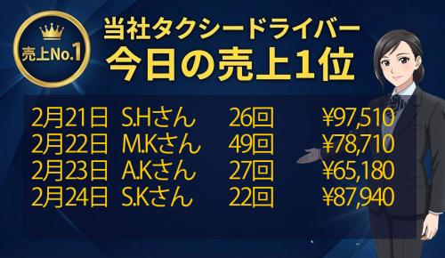 太洋モータース 今日の売上トップドライバー2月21日 S.Hさん 26回 ¥97,510