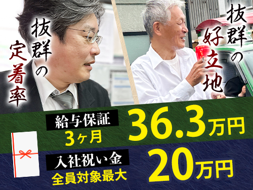 ノルマなし!こんなに働きやすい会社はない!★健康であれば生涯働けます!★自慢の社内雰囲気の良さと好待遇で定着率100%★全員対象!入社祝い金最大20万円★未経験者3ヶ間月給36万3...